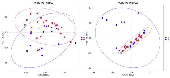 Principal coordinate analysis (PCoA) plots based on weighted and unweighted UniFrac distances, illustrating the separation between T2DM and healthy samples. Each point on the plot represents a sample, positioned according to one principal component on the X-axis and another on the Y-axis. The points are color-coded by group. The percentage shown on each axis indicates the contribution of that principal component to the overall variance among the samples.