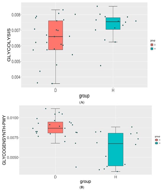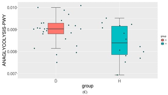 Box plots comparing the relative abundance of specific metabolic pathways between T2DM and healthy individuals: (A) glycogen synthesis pathway; (B) glycolysis pathway; and (C) anaerobic glycolysis pathway.