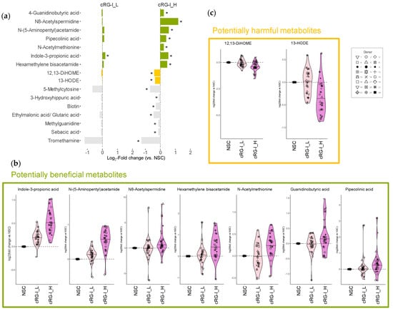 3.3. Fermentation of cRG-I Enhances Production of Beneficial Metabolites and Reduces the Levels of Disease-Associated Linoleic Acid Derivatives