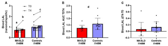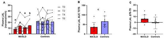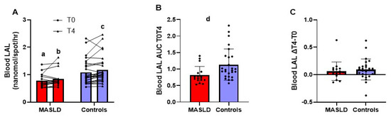 Mischitelli, M.; Poggiogalle, E.; Tozzi, G.; Ferri, F.; Parisse, S.; Meloni, B.; Morrone, A.; Sabbadini, A.; Salem, M.; Gangitano, E.; et al. Reduced Intra- and Extracellular Circulating Postprandial Lysosomal Acid Lipase Activity in Patients with MASLD. Metabolites 2024, 14, 725. https://doi.org/10.3390/metabo14120725