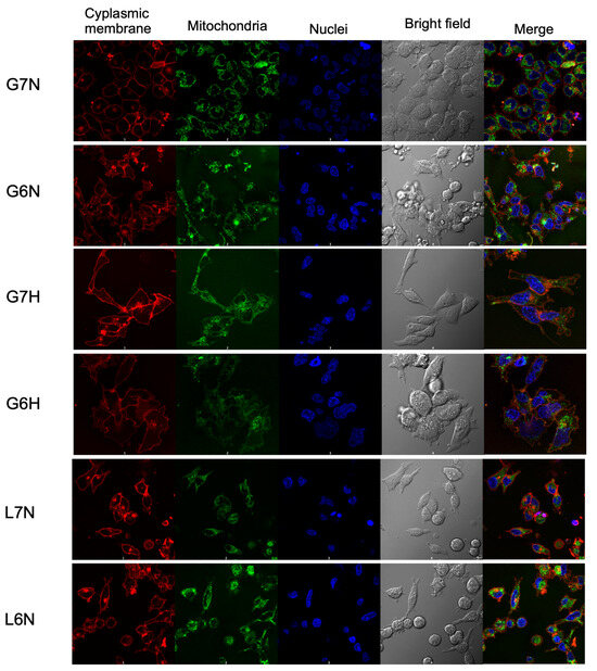 Representative confocal images (60×) of A-427 cells cultured using RPMI-1640 supplemented with glucose (10 mM) and at pH 7.2 or 6.2 under normoxia or hypoxia or using RPMI-1640 supplemented with lactate (20 mM) and at pH 7.2 or 6.2. Cells were stained with CellMask Orange (cytoplasmic membrane), MitoTracker Green (mitochondria), and Hoechst 33342 (nuclei) as in [13].