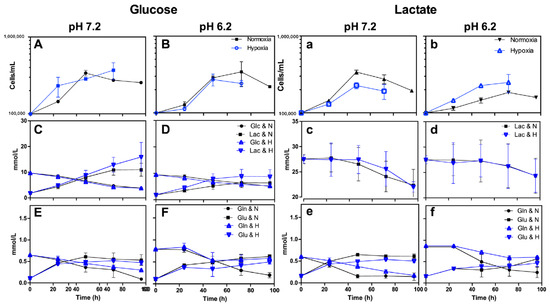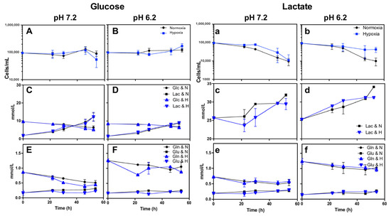 Characterization of Calu-1 using RPMI-1640 supplemented with glucose (10 mM) and at pH 7.2 (A,C,E) or pH 6.2 (B,D,F) or using RPMI-1640 supplemented with lactate (20 mM) and at pH 7.2 (a,c,e) or pH 6.2 (b,d,f). (A,B,a,b) Growth curve, (C,D) glucose consumption and lactate production, (c,d) lactate consumption or production, and (E,F,e,f) glutamine consumption and glutamate production under normoxia (21% O2) or hypoxia (2% O2). GIu, glucose; Lac, lactate; Gln, glutamine; Glu, glutamate.