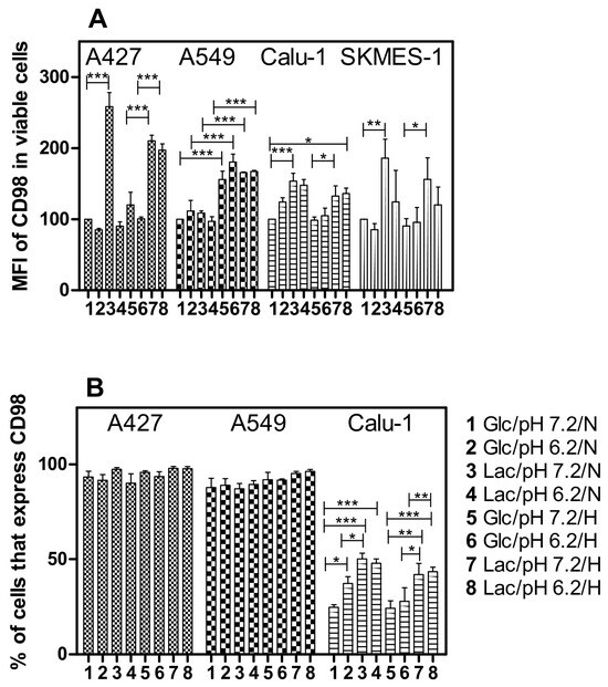 Median fluorescence intensity (MFI) of CD98 signal in lung cancer cell lines (A) and percentage of cells that express CD98 (B). Cells were grown under different culture conditions. Glc, glucose; Lac, lactate, N, normoxia, H, hypoxia; * p < 0.05; ** p < 0.01; *** p < 0.001.