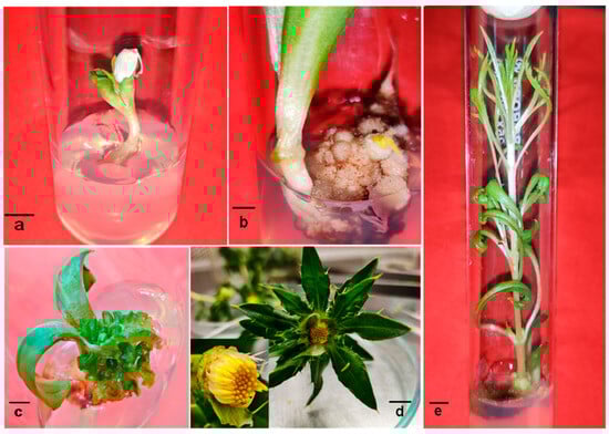In vitro regeneration of Carthamus tinctorius plantlet: in vitro seed germination (a); hypocotyl-derived embryogenic callus (b); embryo germinated plants (c); floral buds on in vitro-regenerated shoot (d); elongated in vitro-regenerated shoot (e) (Bars (a–c): 0.5 cm, (d,e): 1 cm).
