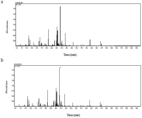 GC–MS profile of total ion chromatogram (TIC) of embryogenic callus (a) and in vitro-regenerated shoot (b) of Carthamus tinctorius L.