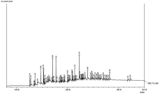 Gas chromatography–mass spectrometry (GC–MS) is a frequently used technique in detecting phytocompounds present in in vitro-grown plant tissue [,]. This methodology is extensively utilized in chemistry, plant science, pharmacology, biotechnology, and biochemistry []. It first separates components from a mixture, identifies unknown compounds, and determines the chemical structure, molecular weight, and other properties []. GC–MS quantifies volatile organic compounds, plant growth regulators, secondary metabolites, and other metabolic compounds in several medicinal important plants like Madagascar Periwinkle (Catharanthus roseus L.) [], rasna (Pluchea lanceolata (DC.) C.B. Clarke) [], thyme (Thymus vulgaris L.), and basil (Ocimum basilicum L.) [].