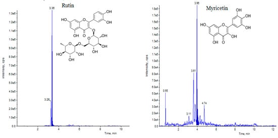 UHPLC–MS/MS (QTRAP 6500) chromatogram of rutin and myricetin flavonoid at retention time 3.36 min and 3.96 min, respectively.