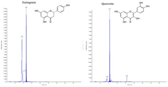 UHPLC–MS/MS (QTRAP 6500) chromatogram of naringenin and quercetin flavonoids at retention time 4.65 min and 4.23 min, respectively.