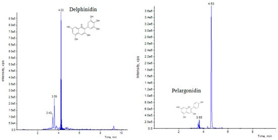 UHPLC–MS/MS (QTRAP 6500) chromatogram of delphinidin and pelargonidin flavonoid at retention time 4.23 min and 3.65 min, respectively.