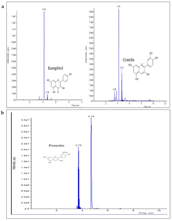 UHPLC–MS/MS (QTRAP 6500) chromatogram of flavonoids, kaempferol and cyanidin (a), and Peonidin (b) at retention time 4.70 min and 3.70 min, respectively.