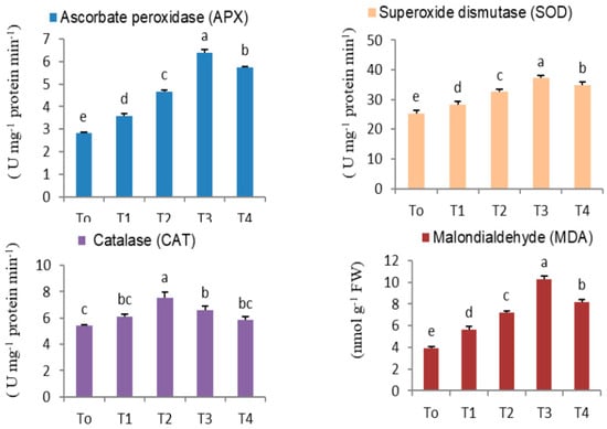 APX, SOD, CAT anti-oxidant enzyme activities and MDA content in in vitro-regenerated safflower shoots after different levels of CdCl2 treatment (T0: Control; T1: 0.05; T2: 0.10; T3: 0.15; T4: 0.20 mM). Values are expressed as means ± standard errors of three replicates of two experiments. Means followed by the same letters are significantly different at p ≤ 0.05 according to Duncan’s multiple range test (DMRT).