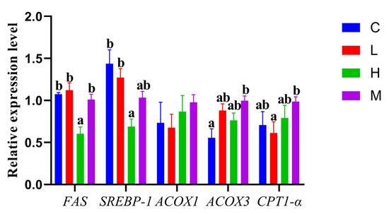 FAS, SREBP-1, ACOX1, ACOX3, and CPT1-α mRNA levels in O. potamophila larvae. Data are represented by the mean ± standard deviation. The same letters over columns indicate non-significant differences (p > 0.05). Significant differences from the control group (group M) are indicated by different letters (p < 0.05).