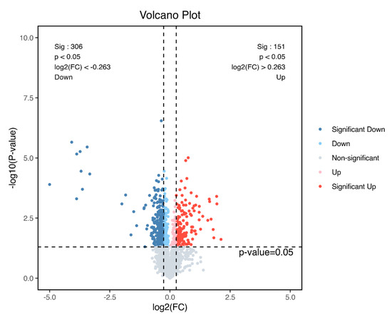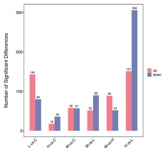 Principal component analysis was performed using plausible protein expression (Figure 3), which identified four distinct clusters. Based on these proteins, we compared screened DEPs two by two; as indicated (Figure 4), significant DEP numbers in group H versus group L differed the most. DEPs were screened using log2(FC) > 0.263 or <−0.263 and p < 0.05 criteria, and as indicated by the volcano plot (Figure 5), up-regulated proteins numbered 151 and down-regulated proteins numbered 306, with a total of 457 identified DEPs.