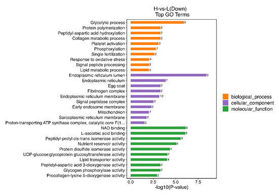 GO functional analysis showed that in group H versus group L (down), DEPs were significantly enriched in the top 30 GO terms (Figure 6), with the most significant effects (p < 0.05) observed for glycolytic processes (GO:0006096) in biological processes, the endoplasmic reticulum lumen (GO:0005788) in cellular components, and nicotinamide adenine dinucleotide (NAD) binding (GO:0051287) in molecular function (p < 0.05).