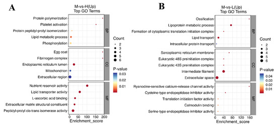 Top Gene Ontology (GO) enrichment terms. The solid circle color and size represent p-values and enriched protein numbers in pathways, respectively. (A) Group M vs. group H (up); (B) group M vs. group L (up).