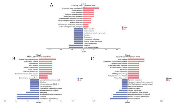 Kyoto Encyclopedia of Genes and Genomes (KEGG) enrichment analysis of up- and down-regulated entries in the 10 pathways with the smallest KEGG up- and down-regulated p-values. Horizontal coordinates indicate the ratio of the number of foreground proteins to the number of background proteins of the pathway (list hits/total hits), and vertical coordinates refer to the KEGG pathway. (A) Group M vs. group H; (B) group M vs. group C; (C) group M vs. group L—some groups were significantly enriched in the up- and down-regulation.