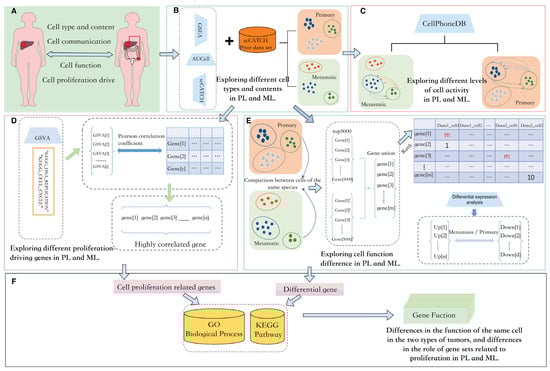 In this study, we planned to investigate primary and metastatic liver cancer from four aspects: cellular composition, cellular communication, cellular function, and cellular proliferation drive, as shown in Figure 1A. We hoped to obtain the differences in cell composition and content between primary and metastatic cancers through the integrated analysis of cell annotation tools such as Gene Set Enrichment Analysis(GSEA) [22], the activity of these regulons is quantified via an enrichment score for the regulon’s target genes( AUCell) [23], and single cell Cluster-based Annotation Toolkit for Cellular Heterogeneity(scCATCH) [24], as shown in Figure 1B. Following this, we planned to use CellPhoneDB to distribute the communication of each part of the cells as in Figure 1C. We also paid attention to cell proliferation genes in tumor tissues. Gene set variation analysis (GSVA) was used to calculate the enrichment scores of each cell in the “KEGG_DNA_REPLICATION” and “KEGG_CELL_CYCLE” pathways, and Pearson correlation coefficients were used to select the highly relevant genes as shown in Figure 1D. In the two types of tumors, although the same type of cells are bound to have differences in specific functions, we planned to obtain differential genes through rank-based differential analysis., as in Figure 1E. Analysis based on a single gene made it difficult to reflect biological characteristics. To explore the function of feature genes, we conducted Gene Ontology Biological Process(GO:BP) [25] and Kyoto Encyclopedia of Genes and Genomes(KEGG) [26] enrichment analysis for proliferation-related genes and differential genes of various parts to obtain the specific functions of these feature genes, as shown in Figure 1F. The specific processes and tools are shown in Figure 1.