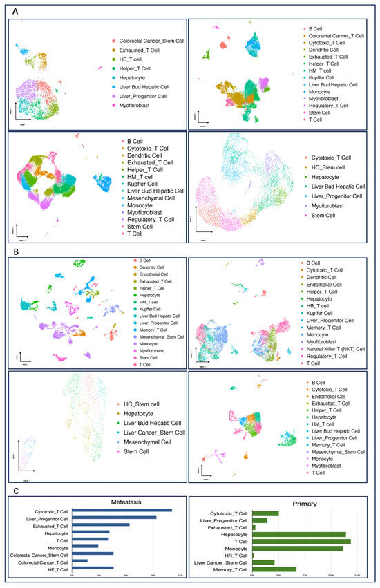 Cell composition of primary and metastatic cancers. (A): Cell annotated images of four sets of colorectal cancer liver metastasis data, in order: GSE158692, GSE164522, GSE178318, GSE225857; (B): Annotated images of cell types for four sets of primary liver cancer data, in order: GSE149614, GSE166635, GSE188289, GSE210679. (C): Comparison of the percentage content of each cell type in primary and metastatic cancers. HE_T cell:Hepatocellular Cancer_Exhausted_T Cell; HM_T cell: Hepatocellular Cancer_Mucosal-Associated Invariant_T Cell; HC_Stem cell:Hepatocellular Cancer_Stem Cell; HR_T cell: Hepatocellular Cancer_Regulatory_T Cell.