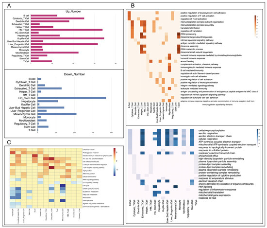 Functional difference analysis of the same cell type in two types of tumors. (A): The number of up- and downregulated genes in each cell type, the figure above is downregulated and the one below is upregulated. (B): The GO BP enrichment results of differential genes between primary and metastatic cancers, the figure above is upregulated and the one below is downregulated. (C): The results of KEGG enrichment of differentiated genes in primary and metastatic cancers. HE_T cell:Hepatocellular Cancer_Exhausted_T Cell; HM_T cell: Hepatocellular Cancer_Mucosal-Associated Invariant_T Cell; HC_Stem cell:Hepatocellular Cancer_Stem Cell; HR_T cell: Hepatocellular Cancer_Regulatory_T Cell.