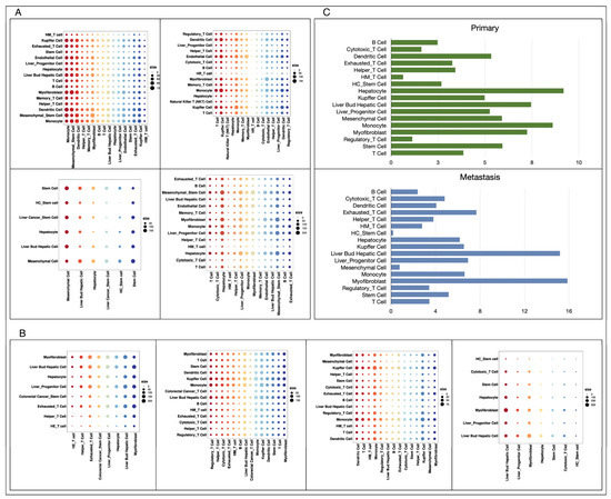 We analyzed cell communication in metastatic and primary cancer tissues separately by using CellPhoneDB, which measures the activity degree of cell-type-specific receptor and ligands in each set of data, and the results are shown in Figure 4A and Figure 4B, respectively. The experimental results showed that there was no significant difference in the overall number of receptors and ligands between metastatic cancer and primary cancer tissue cells, but the number of receptor–ligand pairs contained in each cell type varied considerably, as illustrated in Figure 4C. In primary liver cancer tissues, hepatocytes are the cell type containing the most receptor–ligand pairs, followed by monocytes and liver progenitor cells, while in metastatic liver cancer originating from colorectal cancer, myofibroblasts become the members containing the most receptor–ligand pairs, followed by liver bud hepatic cells and exhausted T cells.