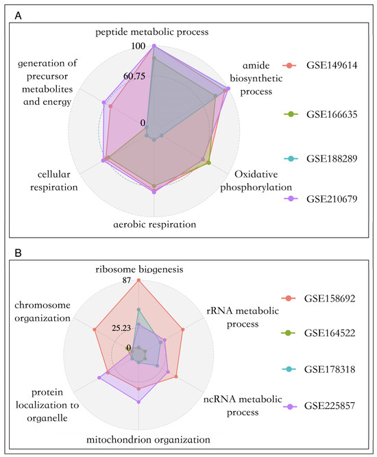 We found that across four sets of primary cancer data, there were no genes significantly negatively correlated with the two proliferation pathways. The same phenomenon has been observed in most metastatic cancer datasets, whicI notice that the GSE in Figure 5 is italicized, please confirm that you are invited to change it to italicized. Please note that this should be consistent throughout the texth is in line with the reality of the infinite proliferative properties of cancer cells [45]. Therefore, we conducted functional enrichment analysis for genes positively related to cell proliferation in the two tumors, and the results are shown in Figure 5A and 5B. In primary liver cancer, the genes highly associated with cell proliferation mainly participate in biological processes such as amide biosynthetic process (p-value = 1 ×10−94), oxidative phosphorylation (p-value = 1.78 × 10−51), and aerobic respiration (p-value = 3.16 × 10−49), while genes in metastatic cancer mainly regulate rRNA metabolic processes (p-value = 1 × 10−27) and ribosome biogenesis (p-value = 3.16 × 10−42).