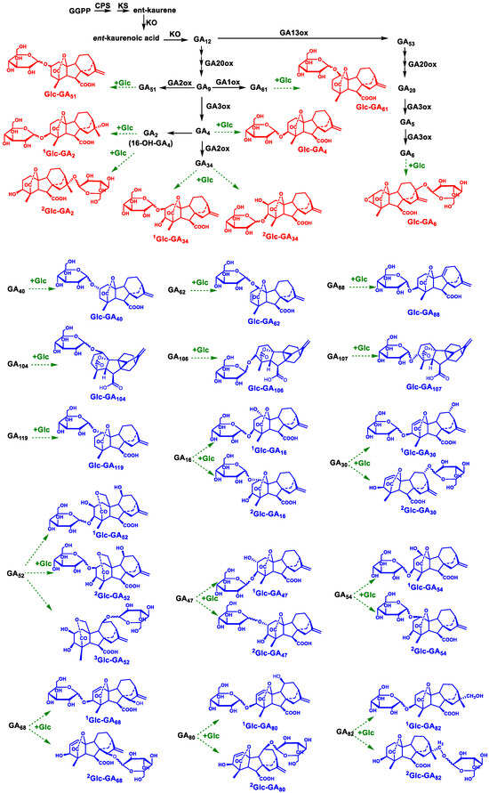 - Knöfel, H.-D.; Schwarzkopf, E.; Müller, P.; Sembdner, G. Enzymic Glycosylation of Gibberellins. J. Plant Growth Regul. 1984, 3, 127–140. [Google Scholar] [CrossRef]