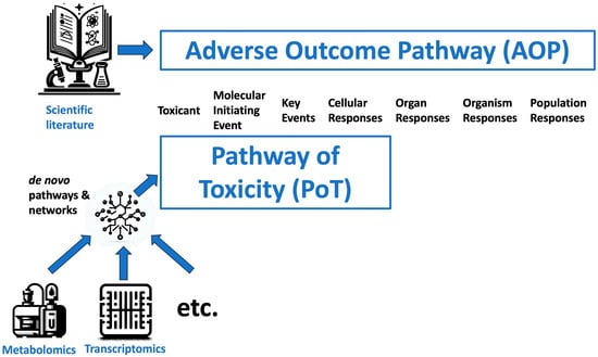A broader assessment of metabolites, as enabled by metabolomics, lends itself to the identification of affected pathways in toxicological research. Adverse outcome pathways (AOPs) and pathways of toxicity (PoTs) represent related conceptual frameworks for organizing toxicological knowledge to support risk assessment. While complementary, they have been defined with distinct perspectives [30]. AOPs were introduced in the field of ecotoxicology and focus on linking mechanistic data to apical hazards or outcomes relevant to regulatory decision making [2]. AOPs connect a molecular initiating event to subsequent key events using causal relationships to provide a plausible narrative explaining how chemical perturbation leads to an adverse effect [31]. They play a critical role in the design of integrated testing strategies [32,33], also known as integrated approaches to testing and assessment (IATA) [34]. However, AOPs do not require a full understanding or representation of every step in the pathway.