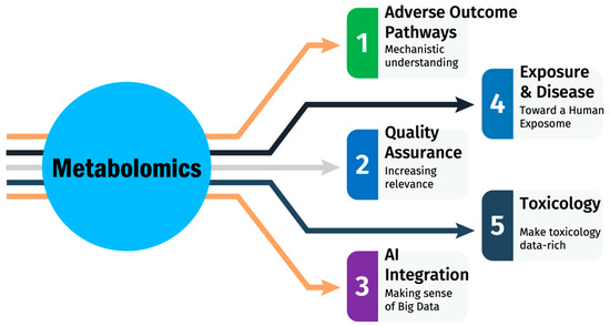 By supporting AOP development, metabolomics strengthens predictive toxicity assessment based on elucidating mechanisms of chemical perturbations. Metabolomics promises to play a key role in elucidating the connection between chemical exposure and human health. The exposome encompasses the totality of environmental exposures an individual experiences across a lifetime [13]. Chemical exposome research utilizing metabolomics can shed light on how such exposures interplay with genes and lifestyle to influence pathogenesis. For example, metabolomics analysis of urine can detect metabolic changes following chemical exposures [14]. Furthermore, the ability to acquire metabolomics snapshots of individuals represents a powerful tool for elucidating connections between chemical exposures, metabolic disturbances, and disease outcomes in human population studies [15]. By aiding more accurate exposure assessment and linking exposures to biological impacts, metabolomics research can transform our understanding of environmental influences on human health.