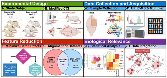 The objective of our study is to integrate exploratory lipidomic and cytokine profiles after mild traumatic brain injury (mTBI) to understand underlying biological processes. The experiments on experimental batch 1 were completed 1.5 years prior to experimental batch 2 (Figure 1A). A modified closed-head cortical control impact device was used to induce sham control, single mTBI (smTBI, 1X), and repetitive mTBI (rmTBI, 3X) injuries for both male and female rats (Figure 1B and Table S1). The 3X groups took a significantly longer time to right compared to the sham control. There were no differences between the sham and 1X groups (Table S1). The male and female 3X groups took significantly longer to right compared to their respective sham control counterparts. This result indicates acute neurological effects following repetitive injury for both combined and separate sexes. The 54 combined brain cortices from experimental batch 1 and 2 were harvested for lipidomic analysis by non-targeted ultra-high-performance liquid chromatography mass spectrometry (UPLC-MS). Fifty-three brain cortices were used for cytokine analysis by a Luminex multiplex assay (Figure 1C,D) due to a missing sample. We further processed the data by reducing features to minimize batch effects and obtain annotated features to investigate biological relevance of lipid and inflammation markers (Figure 1E–H).