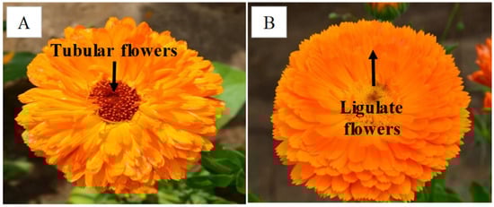 In addition, the proportion of ligulate and tubular flowers in inflorescences may vary depending on the cultivar, climate, soil and agronomic conditions [26,31]. It is important to note that these variations are influenced by external factors and may not be consistent across different cultivars or growing conditions. For example, in a study of five cultivars of C. officinalis, the percentage of ligulate flowers in the inflorescences ranged from 51% to 68%, while the percentage of tubular flowers ranged from 10% to 16% [26]. According to [31], the proportion of ligulate flowers compared to tubular flowers in the C. officinalis cultivar ‘Orange’ varied from 13% to 62% in years with different climatic conditions. This variation may strongly influence the phytochemical quality of C. officinalis inflorescences as a source of medicinal preparations, if the ligulate and tubular flowers differ significantly in metabolite content.