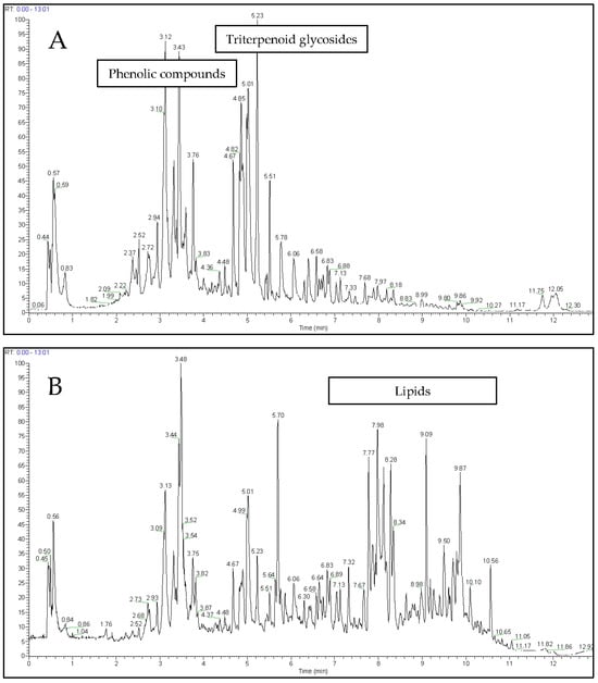 Ligulate and tubular flowers of C. officinalis were extracted with 80% methanol and analysed using UPLC-PDA-HRMS in negative and positive ionisation modes (Figure 2A,B). Comparison of the MS profiles of the master sample under different ionisation modes showed that phenolic compounds and triterpenoid glycosides were more efficiently recorded as negative ions (Figure 2A). In contrast, lipids were better analysed as positive ions (Figure 2B). The total number of negative m/z ions found in extracts of C. officinalis flowers was 18,467, and for positive ions, the number was 25,593.