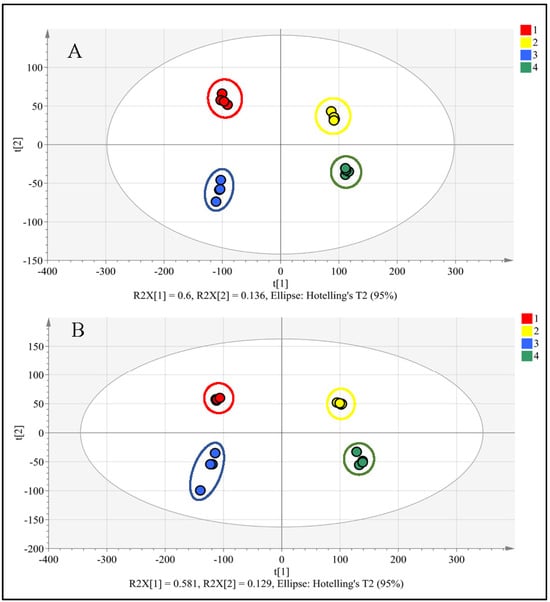 Visualisation of differences in the metabolome of ligulate and tubular flowers of two cultivars of Calendula officinalis by the PCA method. (A) MS registration of negative ions used for the analysis of phenolic compounds and triterpenoid glycosides (16 samples, 18,467 ions); (B) MS registration of positive ions used for polar lipids analysis (16 samples, 25,593 ions). Groups of samples: 1. cultivar ‘Paradise Garden’, ligulate flowers; 2. cultivar ‘Paradise Garden’, tubular flowers; 3. cultivar ‘Golden Sea’, ligulate flowers; 4. cultivar ‘Golden Sea’, tubular flowers.
