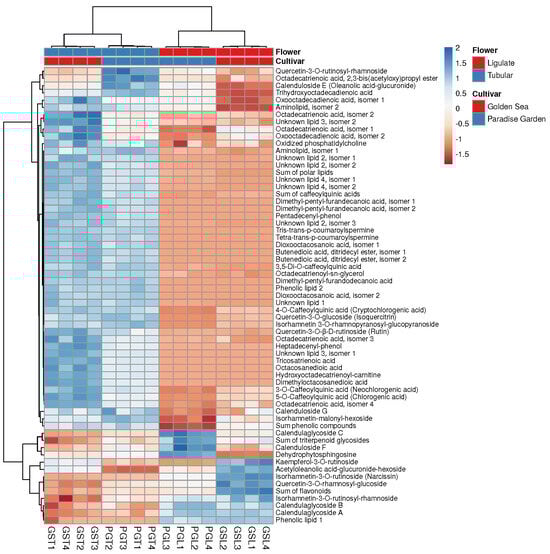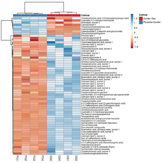 The metabolome differences between the identical flowers of the two C. officinalis cultivars, GS and PG, were found to be minimal. However, since the primary raw material for medicinal products derived from C. officinalis are the inflorescences [25], it was more appropriate to compare the metabolite content of the two cultivars using data for inflorescences.