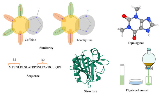 When considering substrates, the approach used differs significantly from that employed for enzymes due to the disparity in size. However, common factors such as similarity, compound topology, and properties remain crucial in the analysis. Kroll used a topological approach based on fingerprints and properties to predict the value of the Michaelis constant in enzyme–substrate pairs, testing it in 47 model organisms and obtaining values similar to the original ones [49]. Yang compared the results achieved through similarity-based approaches and topology-based approaches, noting that they do not yet match experimental standards but show promise [51]. Additionally, Yang introduced a novel topology-based approach. Figure 2 shows graphically an example of each of the categories of molecular descriptors mentioned above. If you want to delve deeper into molecular descriptors, the Supplementary Material accompanying this article is available for your consultation.