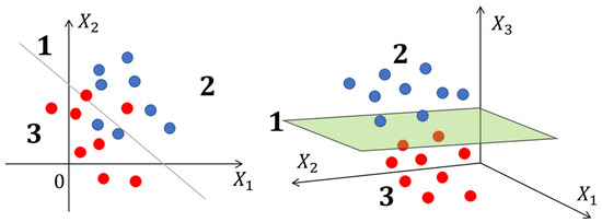 Data separation in a support vector machine for 2 and 3 dimensions (left and right respectively). The red and blue circles and spheres represent the training data, with the red ones being negative data and the blue ones being positive data. The data separation is performed using a line (in 2D) or a plane (in 3D). In region 2, positive data is located, and in region 3, negative data is located.