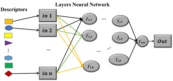 Model of a neural network with n descriptors as inputs, j layers, k neurons per layer, and one output. The geometric shapes and colors represent the different molecular descriptors and features that enter the model. The arrows indicate the connections or dependencies, also representing how information flows in the network.