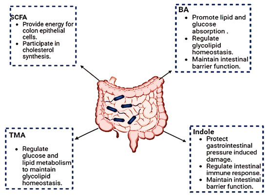 The human host and the gut microbiota interact as a “metabolic organ” which carries out a variety of vital tasks to safeguard human health [17]. The human host can make use of various energy sources due to the gut bacteria’s metabolic activities. Studies on the metabolic profiles of humans and animals have shown that the microbiota can particularly influence how dietary lipids are absorbed, stored, and used. Understanding the functions of these gut microbiome metabolites is crucial for unravelling their impact on host health. The gut microbiota produces organic fatty acids called SCFAs (short-chain fatty acids) through the anaerobic fermentation of non-digestible proteins and fibers, mostly from acetate, propionate, and butyrate [18]. SCFAs play a crucial role in energy metabolism, immune modulation, and maintaining gut barrier integrity. Recent studies have highlighted their potential therapeutic applications in conditions such as inflammatory bowel disease and metabolic disorders [19]. The production of SCFAs is a crucial “microbiota function”. Intestinal epithelial cell proliferation and differentiation are positively influenced by SCFAs, particularly acetate, propionate, and butyrate, which also have diverse metabolic properties [20]. Actually, under normal circumstances, SCFAs supply 5–10% of the usual energy requirements. Key microbial species involved in this process, such as Bacteroides and Firmicutes, contribute to the enzymatic breakdown of complex carbohydrates, yielding SCFAs [21]. The colonic defense barrier can be strengthened by butyrate by increasing mucin production, trefoil factors, and antimicrobial peptides. SCFAs influence host energy metabolism by serving as substrates for mitochondrial beta-oxidation. Additionally, they enhance gut barrier integrity through the upregulation of tight junction proteins, such as ZO-1 and occludin [22]. Butyrate is employed as an energy source for colonocytes. Additionally, butyrate has several impacts on a range of cell types, including immunological regulation, cell cycle inhibition, the induction of programmed cell death, and cellular differentiation [14]. Gut microbiome metabolites also include bile acids, which are produced through the metabolism of host-derived bile. The gut microbiome influences bile acid composition, impacting host metabolism and signaling pathways [23]. The GM modulates bile acid homeostasis. By modulating the expression of bile acid-production enzymes, the microbiome participates in the synthesis of principal bile acids, cholic acid and chenodeoxycholic acid. Other bile acid metabolism processes affected by the GM include conjugation in the liver, reabsorption in the terminal ileum, and deconjugation in the small intestine [24,25]. Figure 1 summarizes the role of metabolites.