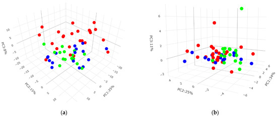 PCA plots of (a) plasma lipids and (b) fecal bile acids. Healthy (green), Dys (blue), and Dia (red) solid dots.