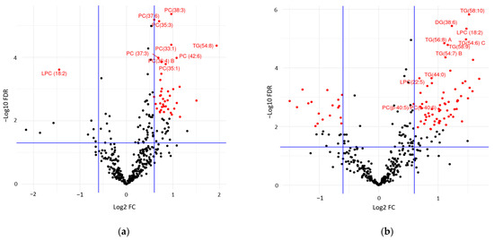 Volcano plot of −Log10(FDR) of adjusted p-value vs. Log2(FC) for all lipids following univariate and multivariate analyses. Red dots reveal the most significant features (i.e., the top ten annotated VIP-ranked lipids) for (a) Healthy vs. Dys and (b) Dys vs. Dia samples. The horizontal blue lines represent an FDR of 0.05, while the vertical blue lines indicate an FC of 1.5 and 1/1.5.
