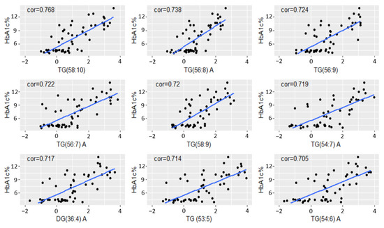 Pearson correlation plots (>0.70) of HbA1c% and various long-chain polyunsaturated DGs or TGs. The data was detrended by age, sex, and body weight. A and B denote structural stereoisomers of DG and TG. The blue lines represent fitted regression lines (cor) between HbA1c% and various TG lipids.