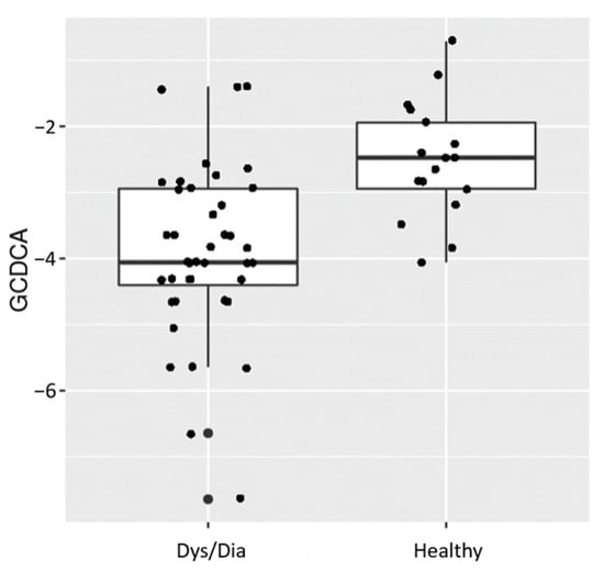 The higher the importance score, the more influential this variable was when distinguishing Dys/Dia from Healthy. GCDCA and GCA were the most important fecal metabolites used to distinguish between different groups of animals (Figure 4). Univariate weighted t-tests revealed directionality and that GCDCA was most significantly reduced in diseased animals (FDR < 0.001). A boxplot of these results (Figure 5) shows the distribution of log-transformed GCDCA abundances across Healthy and diseased animals. Table S5 lists bile acids that were significantly reduced in Dys/Dia animals.