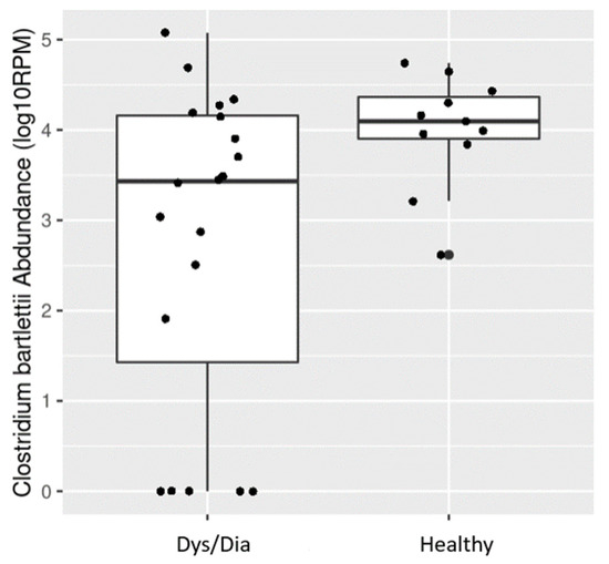 Boxplot of Clostridium bartlettii abundance between two animal groups: Dys/Dia and Healthy. The y axis is the abundance of Clostridium bartlettii species in the unit of reads per million on the log 10 scale (Log10 RPM).