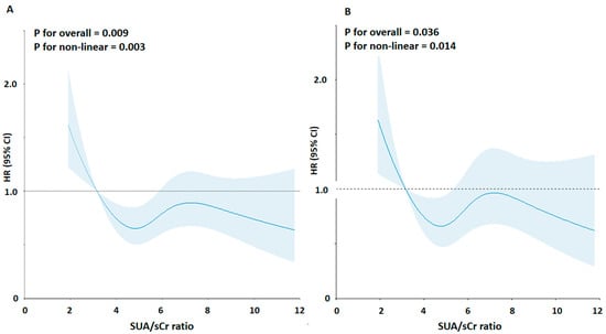 Association between the SUA/sCr ratio and risk of cardiovascular mortality using a Restricted Cubic Spline Regression Model. Solid lines indicate hazard ratios (HRs), and shadow shapes indicate 95% confidence intervals (CIs). (A) Unadjusted; (B) Adjusted for age, gender, body mass index, cigarette smoking, hypertension status, total cholesterol, triglycerides, blood glucose, and statin use.
