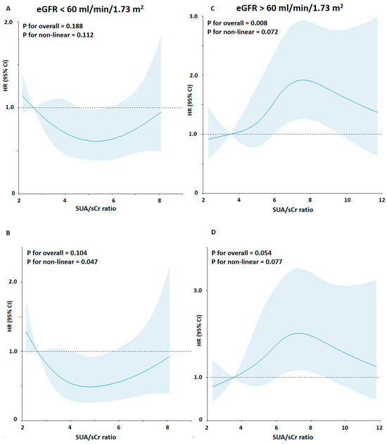 Association between the SUA/sCr ratio and risk of cardiovascular mortality using a Restricted Cubic Spline Regression Model stratified by kidney function. Solid lines indicate hazard ratios (HRs), and shadow shapes indicate 95% confidence intervals (CIs). (A,C) Unadjusted; (B,D) Adjusted for age, gender, body mass index, cigarette smoking, hypertension status, total cholesterol, triglycerides, blood glucose, and statin use.