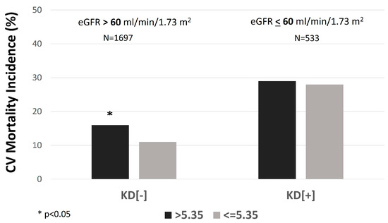 Moreover, the participants of the KD[−] group with a SUA/sCr ratio of more than 5.35 Units had a significantly higher incidence of CV mortality than participants with a SUA/sCr ratio below 5.35 Units (16.0% vs. 10.4%, p = 0.001) (Figure 3).
