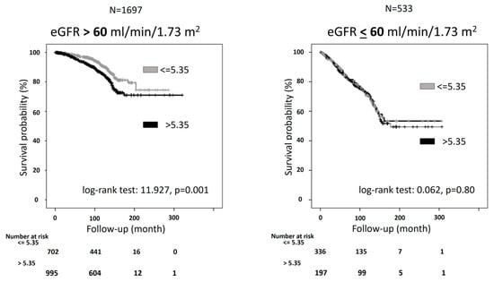 Moreover, also the results from further stratification by different levels of overt kidney dysfunction confirmed this trend in KD[+] (eGFR 45–60 mL/min/1.73 m2, n = 387, 27.2% vs. 22.8%, p = 0.32; eGFR < 45 mL/min/1.73 m2, n = 146, 41.7% vs. 35.8%, p = 0.58).