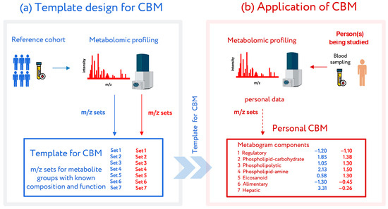 Workflow for the design and application of a clinical blood metabogram (CBM). (a) Template design for CBM. A reference cohort of healthy people was used to obtain a template for CBM with defined sets of mass spectrometry picks corresponding to functionally related metabolite groups in the blood. (b) Application of the CBM. To use a CBM, sampled blood from a person being studied (or people from a study cohort) is subjected to mass spectrometry after sample preparation to separate the metabolome fraction. The resulting mass peaks are aligned with the characterized sets of mass spectrometry peaks from the template for CBM. To obtain CBM components, their intensities are converted into Z-score scales and averaged over each group. CBM components show the state (normal, upregulated, or downregulated) of the blood metabolome groups, providing in this way clinically relevant information. Adapted from [24].
