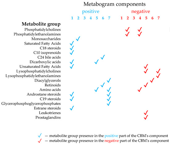 The components of the CBM reflect the functionally related groups of the blood metabolites associated with humoral regulation (component 1, called ‘regulatory’), the lipid–carbohydrate metabolism (component 2), phospholypolysis (component 3, called ‘phospholipolytic’), the lipid–amine metabolism (component 4), oxidized fatty acids (component 5, called ‘eicosanoid’), the lipid intake into the organism (component 6, called ‘alimentary’), and liver function (component 7 called ‘hepatic’), thereby providing clinically relevant information.