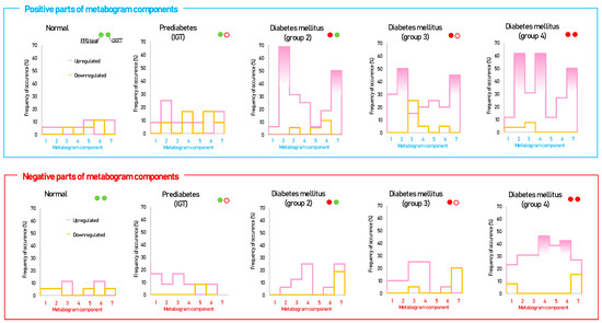 Figure 3 shows that patients with DM have deviations in their metabogram components more frequently than control individuals. Several components deviate from the norm more often. For example, the most frequent is metabolite upregulation, reflected by positive components 2 and 7 in DM groups 2–4, as well as by component 4 in DM group 4 (Figure 4).