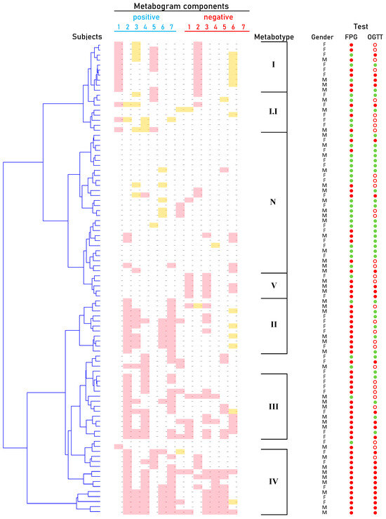 Dendrogram of the clinical blood metabogram (CBM) data of normal subjects and patients with type 2 diabetes mellitus (DM) and prediabetes diagnosed by the presence of impaired glucose tolerance (IGT). Each row corresponds to the Z-scores of the metabogram components for an individual. Z-score is a measure of the metabogram components (from −1.64 to +1.64 is the normal range; up- and downregulation correspond to higher and lower Z-score values, respectively). ‘Positive’ values from 1 to 7 and ‘negative’ values from 1 to 7 correspond to two Z-score scales (see Section 2.3). Color coding: red indicates the upregulation of metabolites corresponding to the metabogram component; yellow indicates the downregulation of metabolites corresponding to the metabogram component. ‘M’, male; ‘F’ female; ‘N’, normal metabotype; FPG, fasting plasma glucose; OGTT, oral glucose tolerance test; (●) FPG < 5.6 mmol/L and < 7.8 mmol/L in OGTT; (●) FPG > 5.6 mmol/L and > 11.0 mmol/L in OGTT; (○) glucose level between 7.8 and 11.0 mmol/L in OGTT.